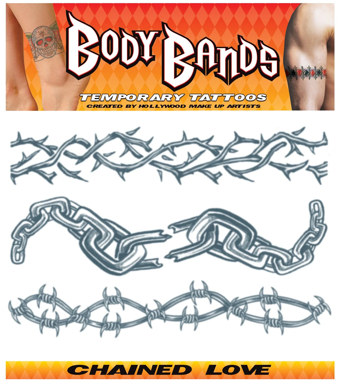 Complete your tough guy look with awesome temporary tattoos this Halloween! Includes a sheet of Chained Love Armband Tattoos that feature a rose vine, a broken chain, and barbed wire. Ware one at a time or all three for that super bad dude look!
