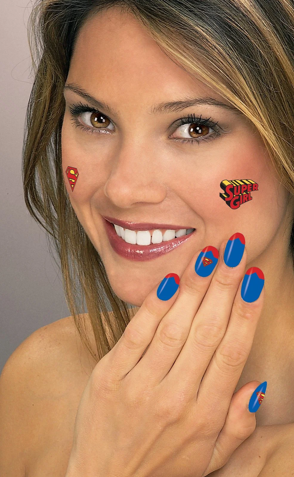 Get ready for high-flying fashion with the DC Superheroes Supergirl Makeup Kit. This item includes 12 themed nail art strips, nail file, wooden stick, and 7 temporary face tattoos.