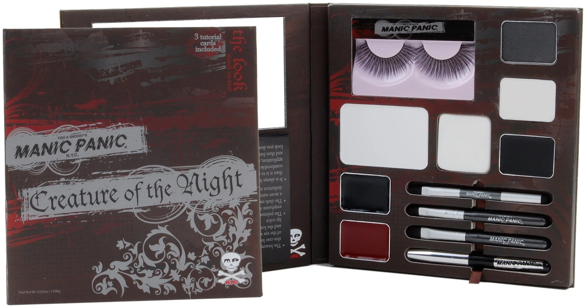 Everything you need to create a polished look is at your fingertips. The Knock ‘Em Dead All-Inclusive Make-Up Kit includes: Eye Shadow (Black), Lip liner (Black), Cream Eyeliner (Jet Black), Spectral Pressed Face Powder, Long and Full Eyelashes, White Cream Base and Highlighter, Lip Lacquers (Red and Black), 1 dual-ended eyeliner applicator, 1 shadow applicator, 1 lip brush and 3 step-by-step make-up guides.