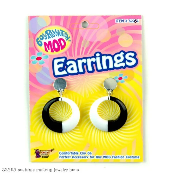 Make a retro fashion statement with our Mod Black and White Hoop Earrings. Includes a pair of black & white hoop style plastic clip on earrings.