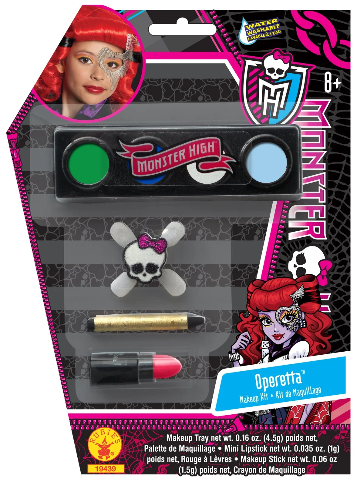 Dare to be different and transform into the trend setting Operetta this Halloween! This product includes a Monster High Operetta Makeup Kit that features a 4 color tray, 2 applicator sponges, a mini lipstick, makeup stick and glitter.